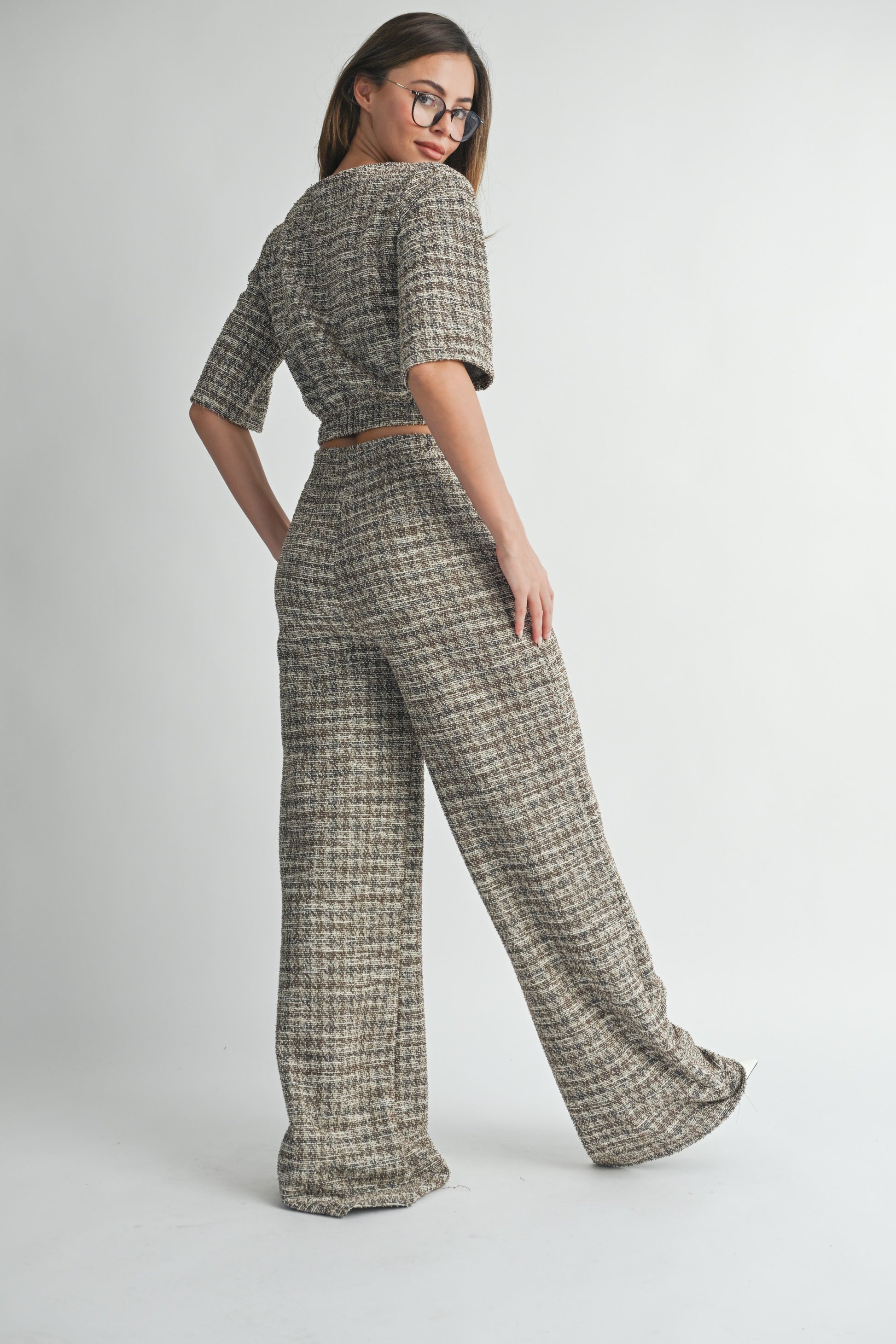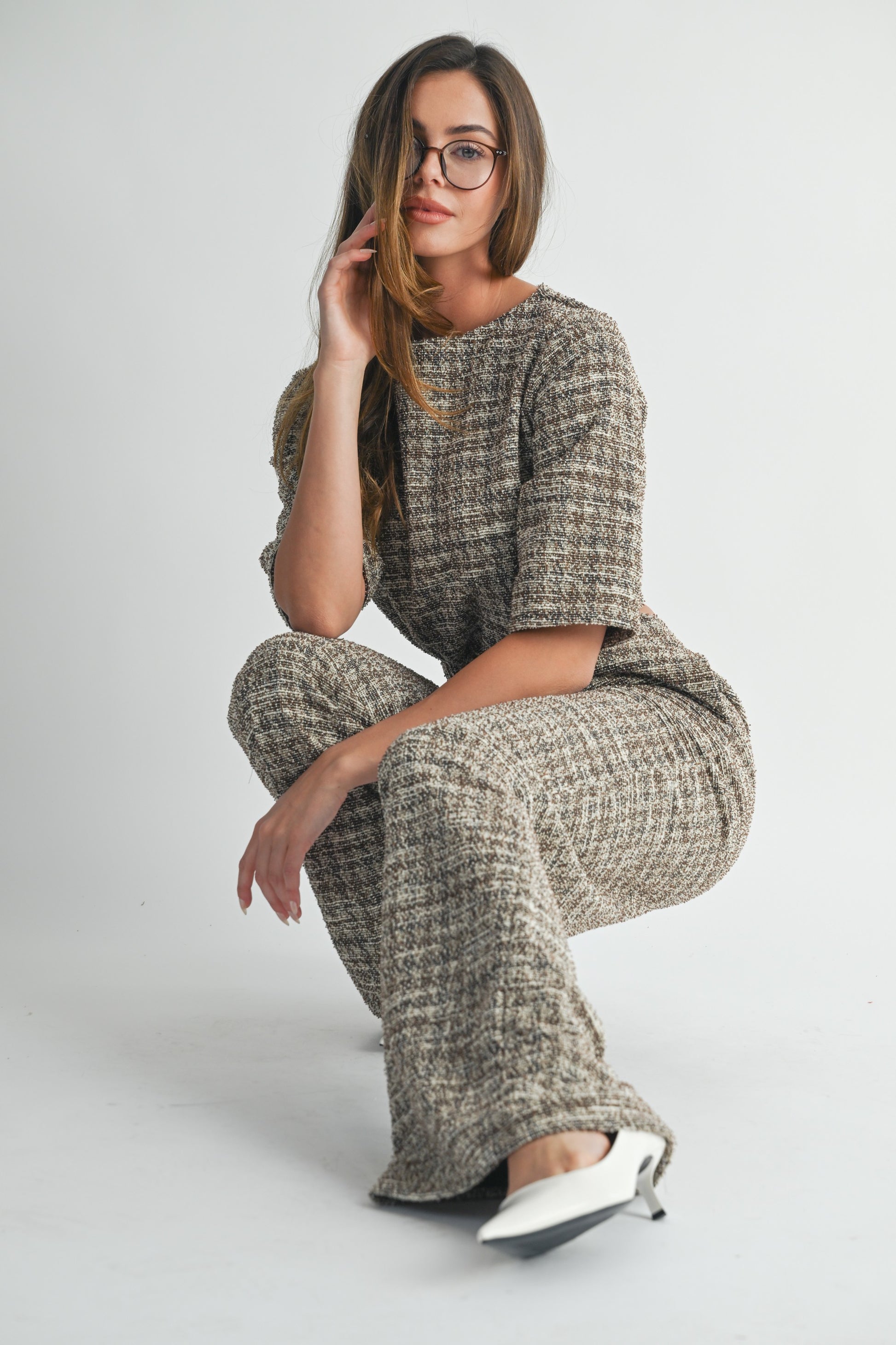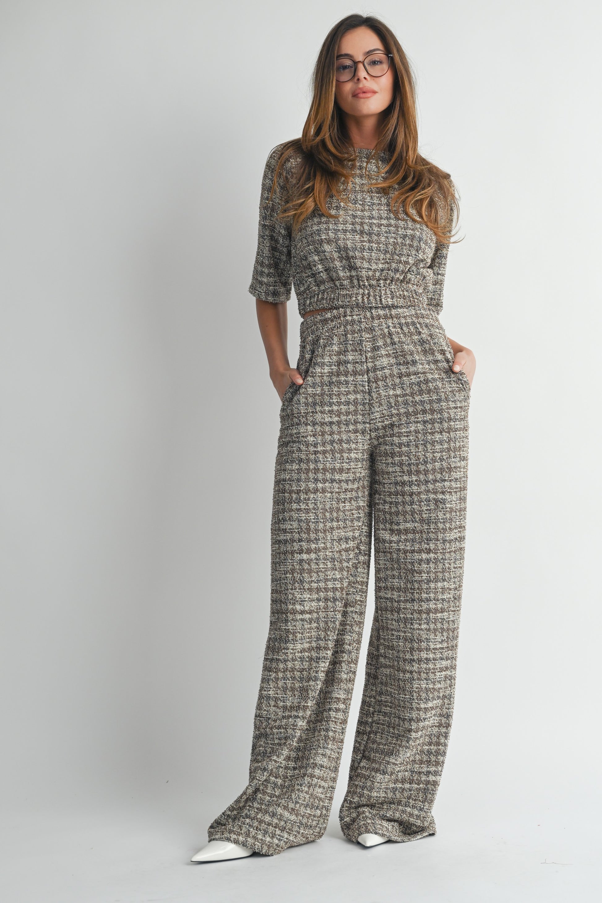 Crosshatch lightweight tweet mocha and brown round neck quarter sleeve top and matching wide leg pants. Pants features an elastic waist and side pockets. Sold as a set. 70% Polyester 25% Rayon 5% Spandex