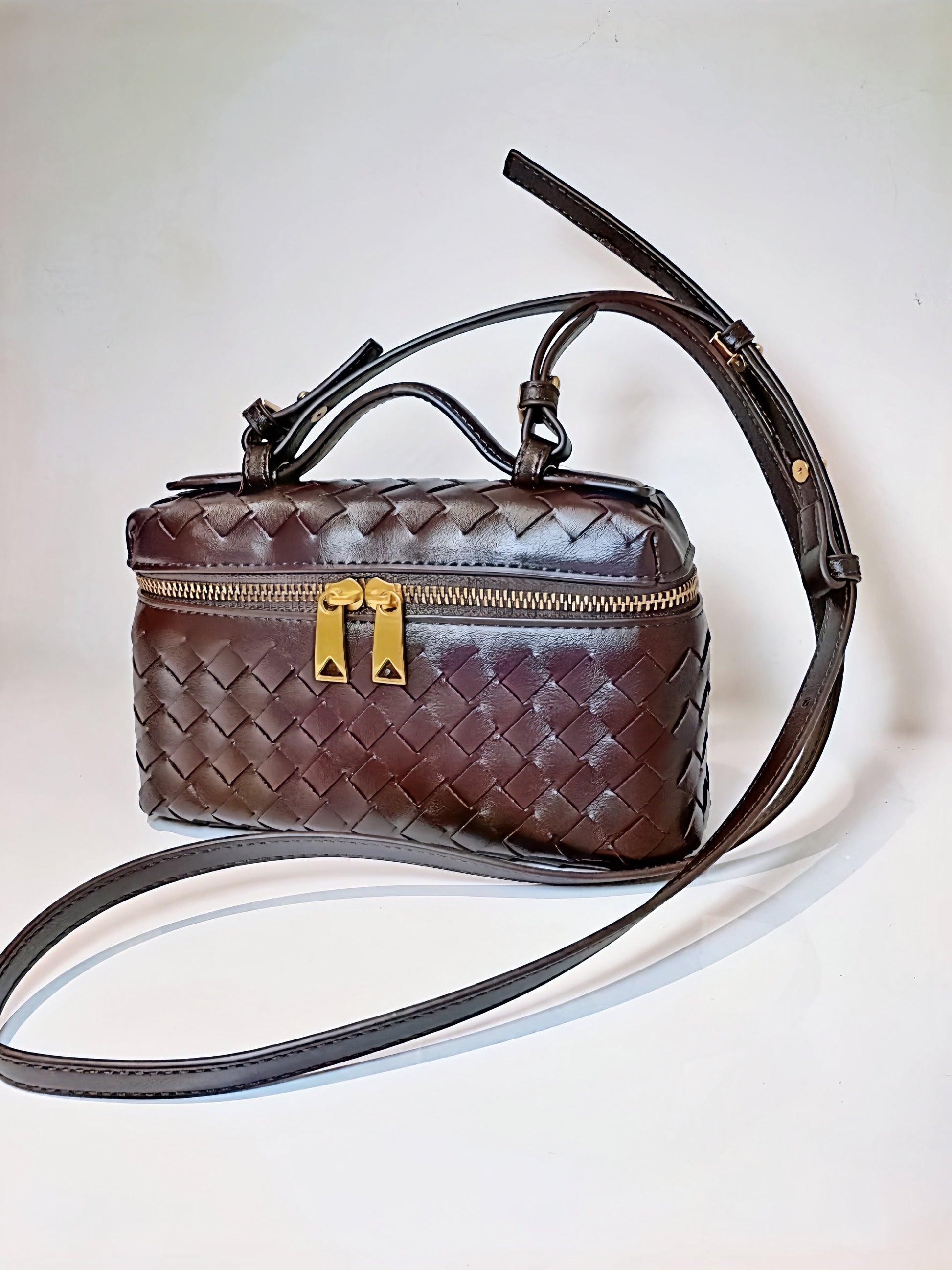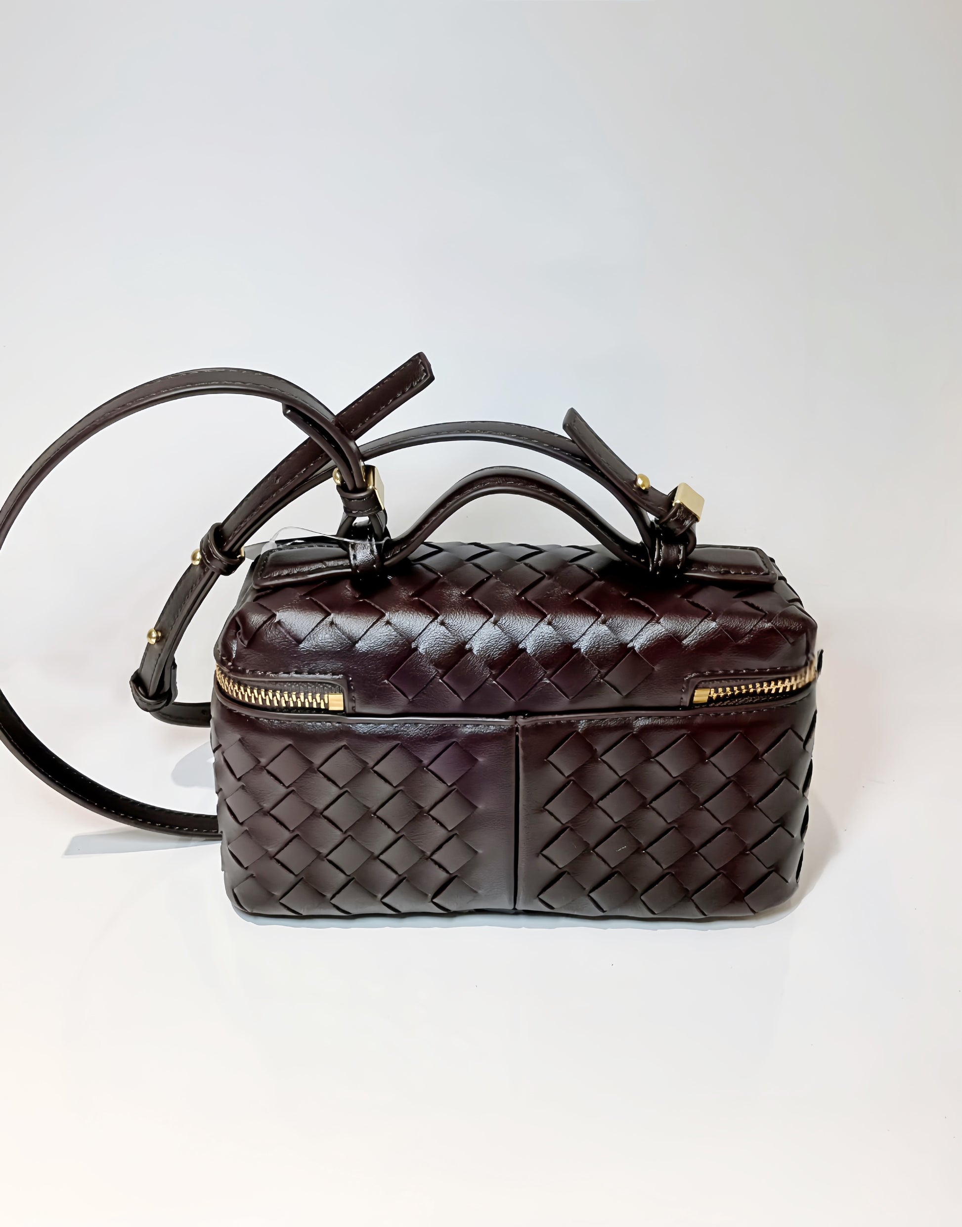 Chocolate Top handle, 1.5" drop. Removable, adjustable crossbody strap, 22" drop. Dimensions: 9"W x 2.25"D x 5"H. All around Zip closure. Interior slip pocket. Signature woven vegan leather. Matte Gold-tone hardware. Fully Lined.