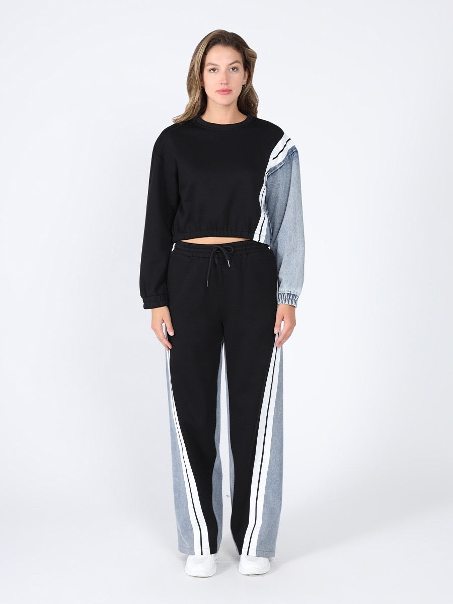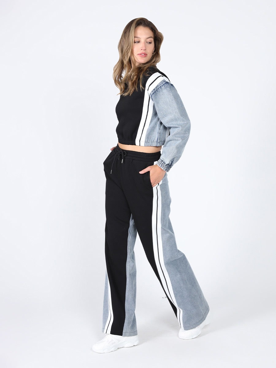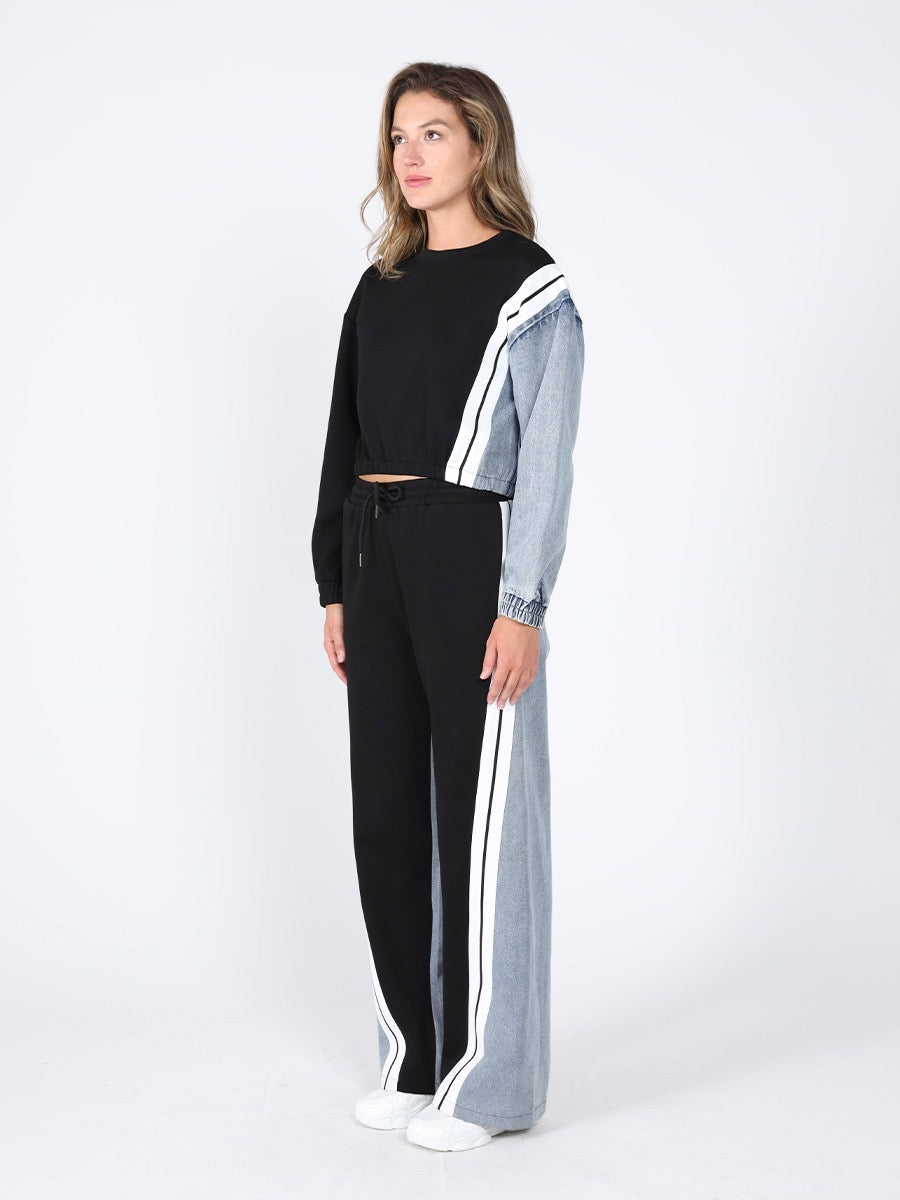 Best selling French terry mixed with denim set. Crewneck body with match wide leg pants.