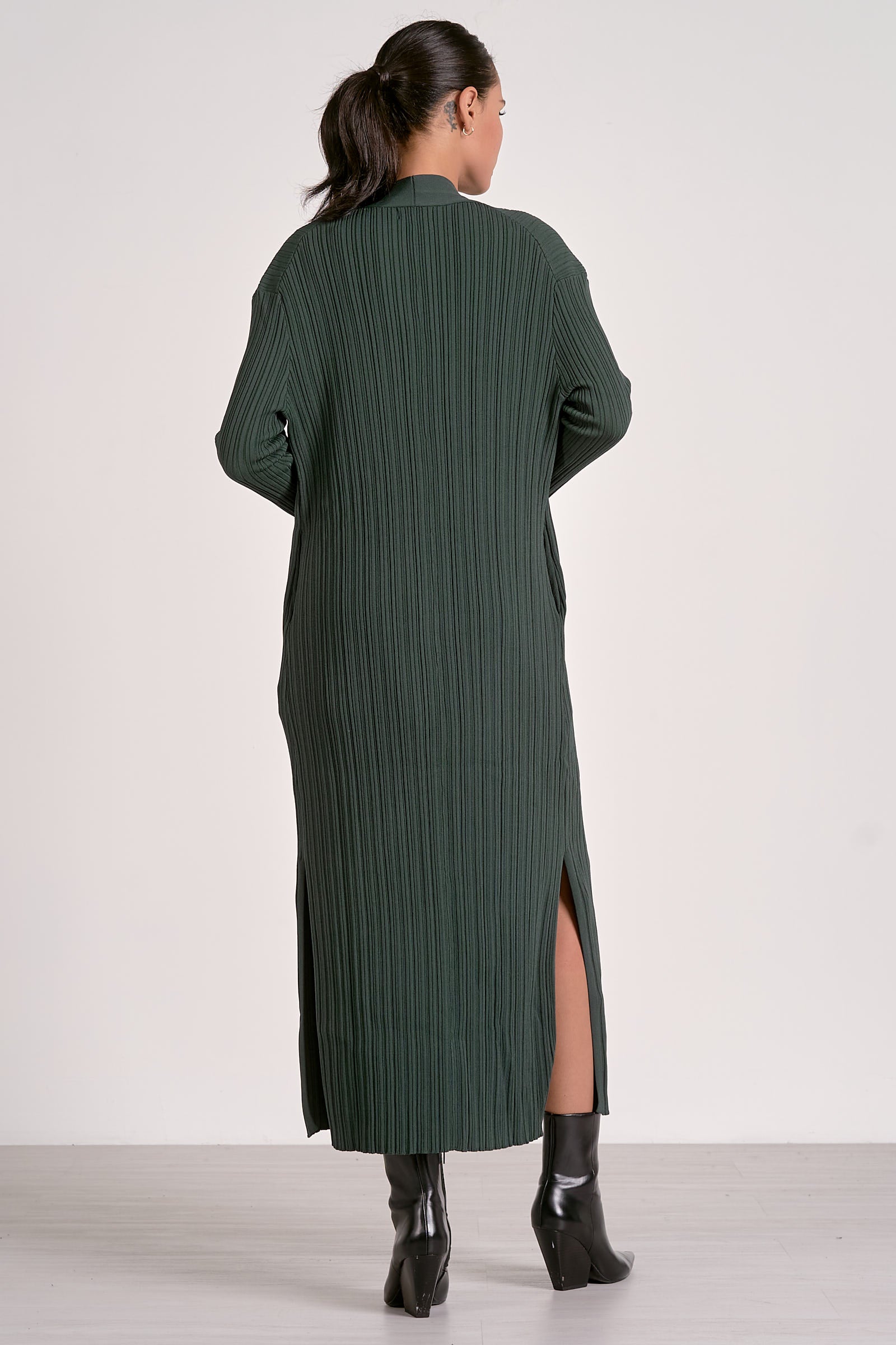 Forest green Full-Length, Sleek, Bell Sleeve Duster Cardigan with Lightweight Ribbed Knit Detailing. Super stretch thick fabric. 60% Viscose, 37% Polyamide, 3% Elastane.